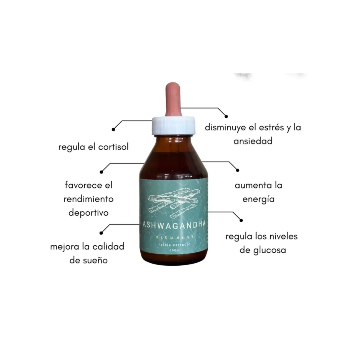 ASHWAGANDHA: Regula el cortisol, disminuye la ansiedad, favorece el rendimiento deportivo, mejora la calidad del sueño, aumenta la energía, regula los niveles de glucosa.