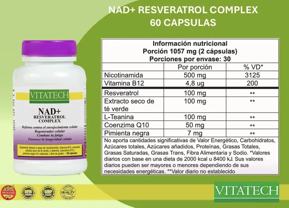 Suplemento dietario a base de VITAMINA B12-NICOTINAMIDA- RESVERATROL-TÉ VERDE- TEANINA- COEZIMA Q10-PIMIENTA NEGRA