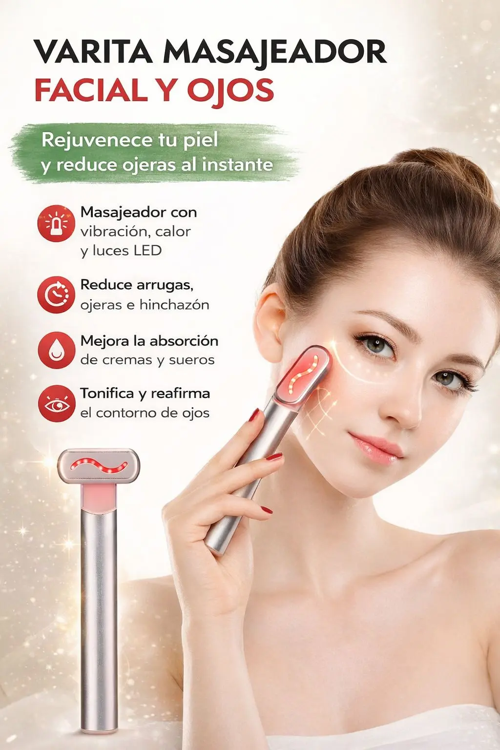 El Masajeador Facial EMS EYES es un dispositivo multifuncional de última generación diseñado para el rejuvenecimiento, firmeza y cuidado profundo de la piel, especialmente en la delicada zona del contorno de ojos. Integra 4 tecnologías dermatológicas avanzadas en un solo equipo portátil, ideal para incorporar a tu rutina diaria de belleza desde casa.