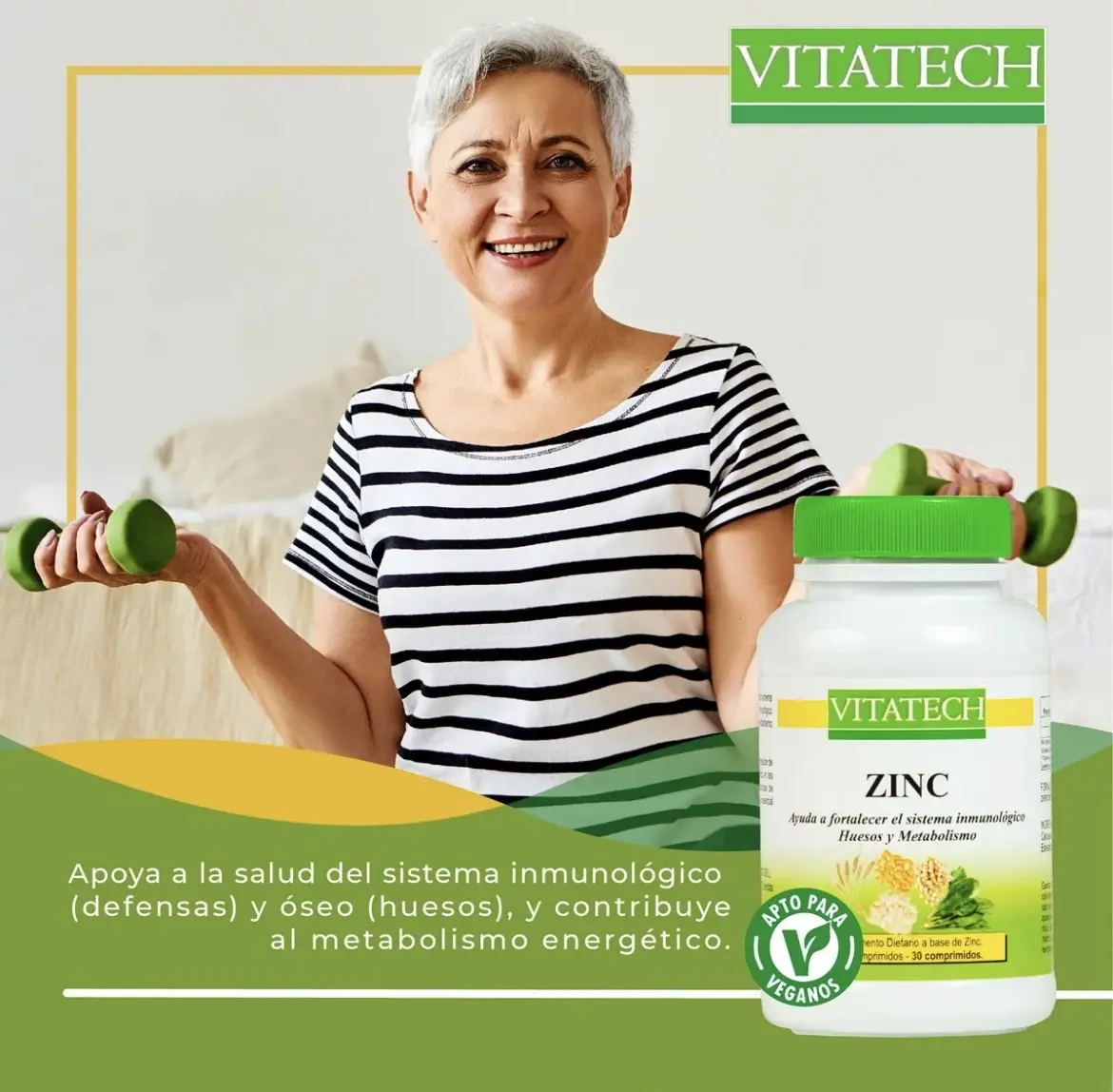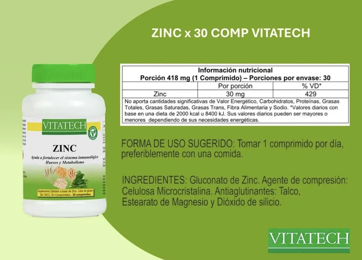 Zinc Vitatech es un suplemento dietario de zinc elaborado por la marca Vitatech, diseñado para aportar este mineral esencial al organismo y apoyar diversas funciones de salud.
